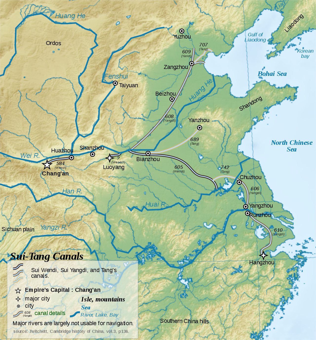 대운하는 7세기 초 수나라 때 만들어진 것이다. 운하의 이로움은 중국에서 일찍부터 인식되어 전국시대부터 축조가 시작되었는데, 북중국과 남중국을 연결하는 ‘대(大)’운하는 남북조의 대립을 끝낸 수나라가 천하제국의 통일성을 담보하기 위해 건설한 것이다.